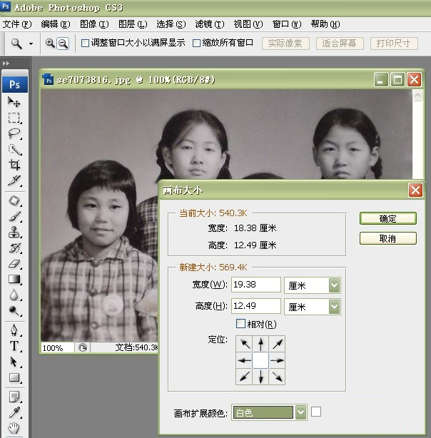 3、然后選擇【畫布擴展顏色】為【白色】,可見老照片的上下部分均以留白;