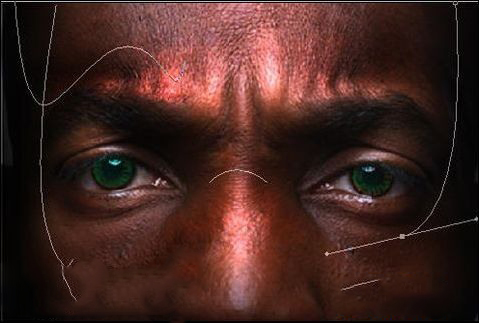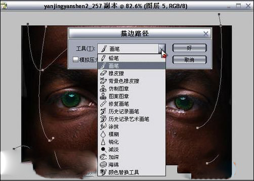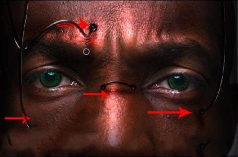 十一、對臉部的玻璃管進行透影處理,(回到人物圖層復制一個圖層,處理錯誤時可以重新開始編輯),用加深工具對示意圖位子進行加深,畫出投影部分,也同時用減淡工具對該位置的亮步進行提亮處理,如圖19-20