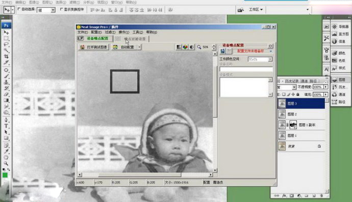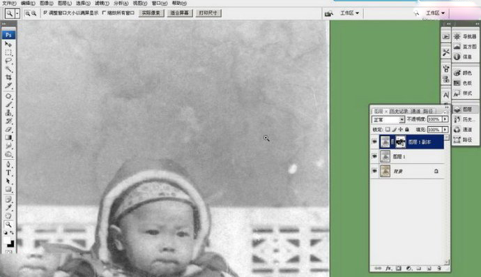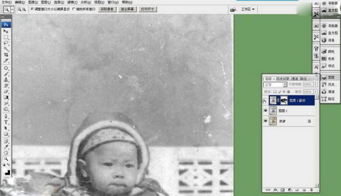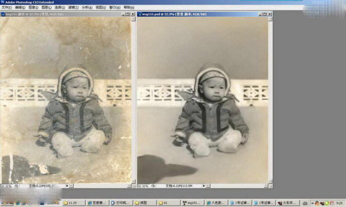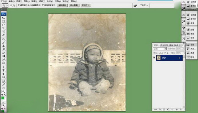 花了大約5分鐘時間,將整體修復干凈了,這里說明下:國科金世紀里的工具比PS更適合處理老照片,所以速度上比較快