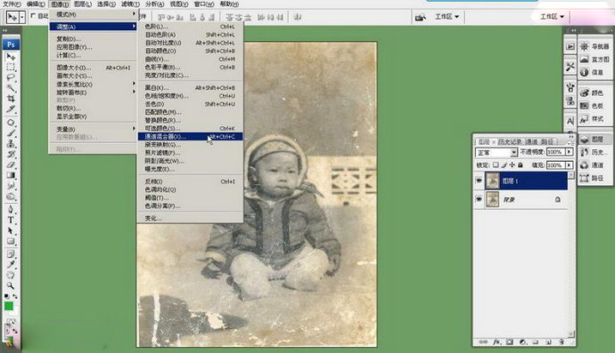 再回到PS里,調整下對比度,還原出原來老照片的焦黃色調.對比下,您學會了嗎