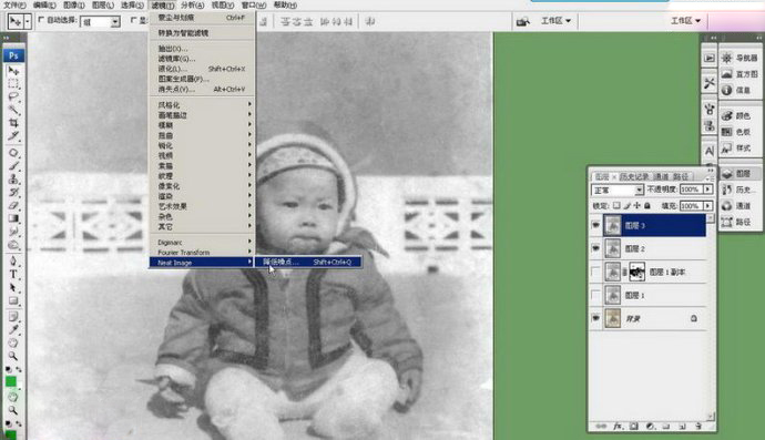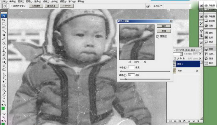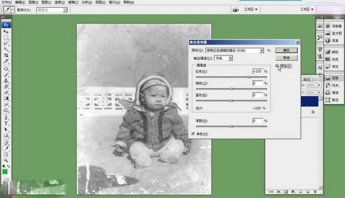 簡介原圖: 效果圖: PS打開原照片 使用通道混合器,將圖片調為黑白色調. 使用蒙塵與劃痕將照片上小臟點先去掉,大的臟點進行二次祛除. 復制一個新圖層,再次使用蒙塵與劃痕,這次的參數不