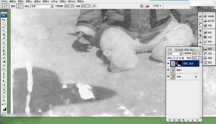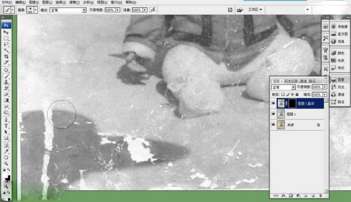 添加一個黑色蒙板,設置白色為前景色,當前圖層為圖層1 副本里的蒙板,然后用畫筆涂去照片上比較大的臟點.