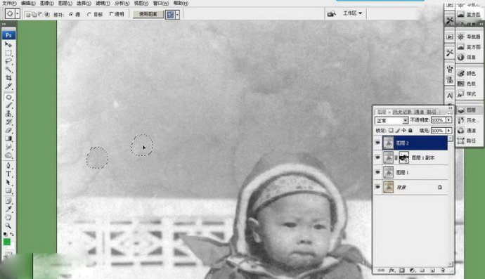 使用蒙塵與劃痕將照片上小臟點先去掉,大的臟點進行二次祛除.