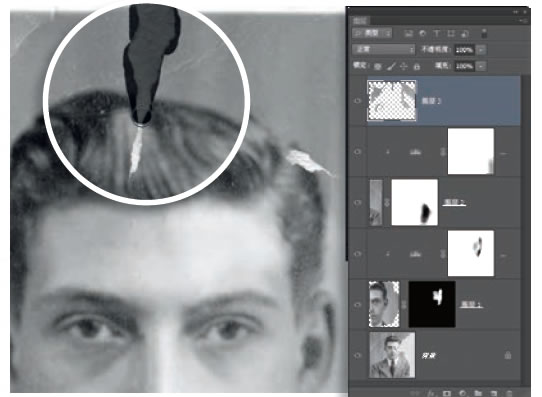 敲擊回車應用調整, 將圖層不透明度設置為100%,然后將該圖層拖放至圖層面板的最上方。重復前面的操作,按住Alt鍵創建黑色蒙版,使用白色畫筆還原原圖中缺損的部分。然后按照步驟05中的技巧創建調整圖層,讓影調更匹配。