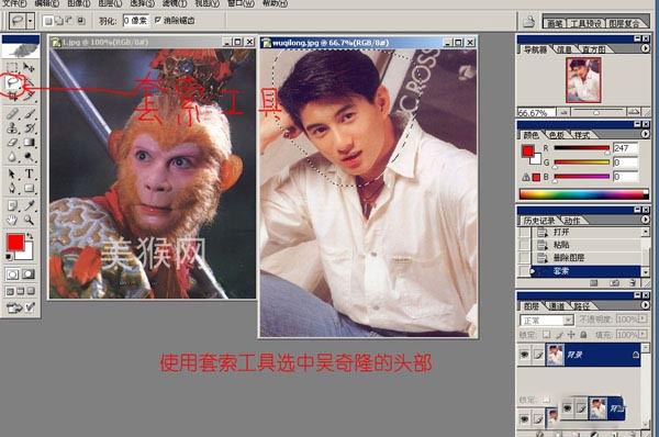 第三步: 按住B鍵(在英文輸入法下,以下也一樣)將吳奇隆的頭部拖到孫悟空?qǐng)D片上面。