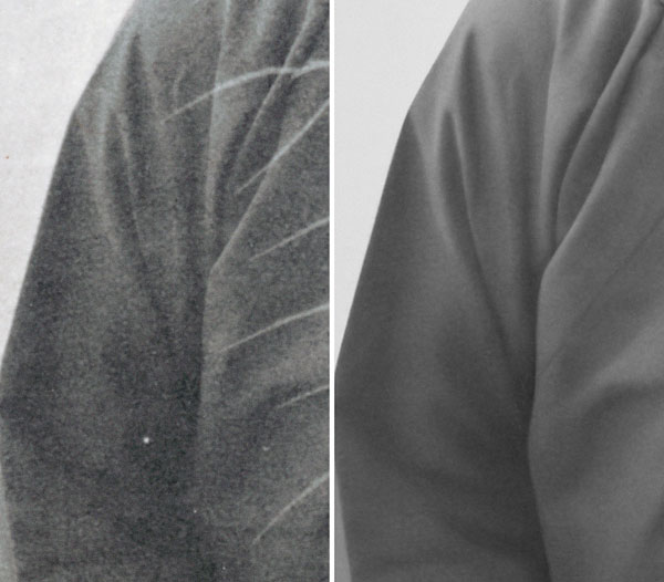 很多時候,在修復衣服部分的時候,修片師會直接找一件差不多的衣服換了,原照片明明是普通中山裝,修復好的效果卻換上了現代筆挺的西裝,當然,也有很多是客戶的要求。